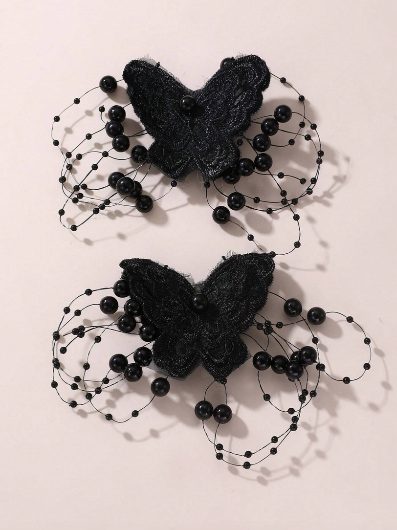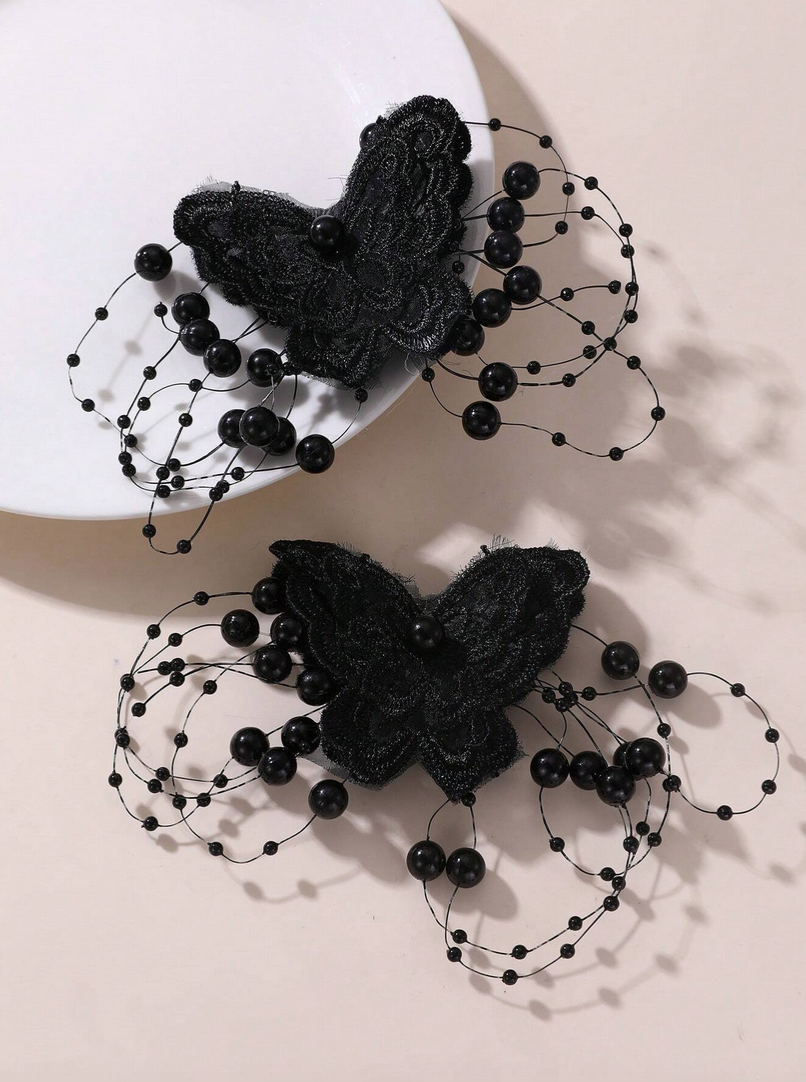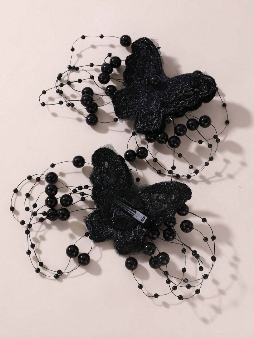 Izrađene od nježne čipke s profinjenim uzorkom, ukosnice oduševljavaju svojom suptilnošću i jedinstvenom završnom obradom. Svakog leptira krase crni biseri postavljeni na tanke žičice koje stvaraju efektnu kompoziciju punu lakoće i pokreta. Ovi pažljivo ispleteni biseri čine ukosnice izuzetno elegantnima, dodajući dječjoj frizuri pomalo bajkovit karakter.