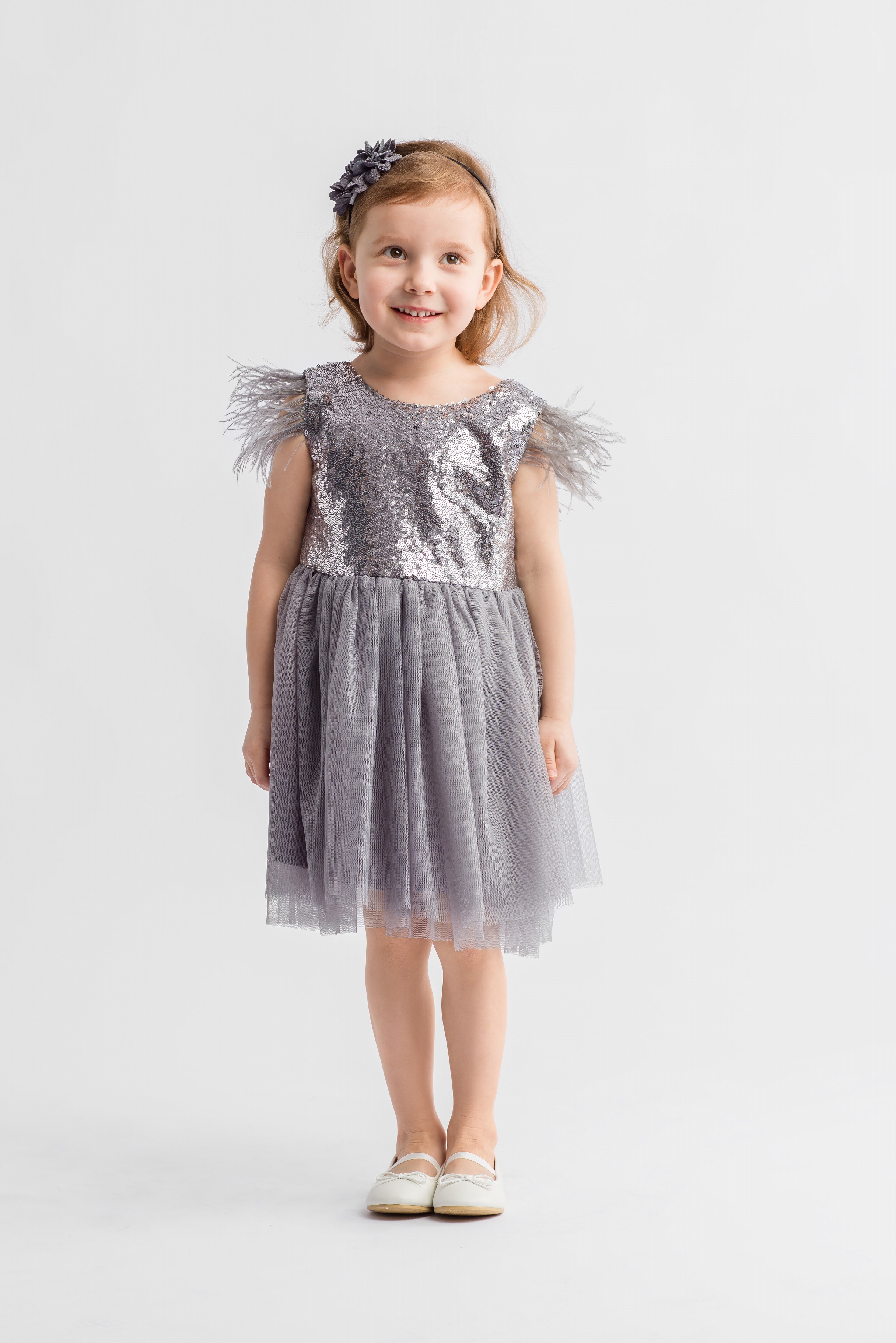 Elegantna, svečana haljina za djevojčicu Chloe u sivoj boji sa šljokicama.