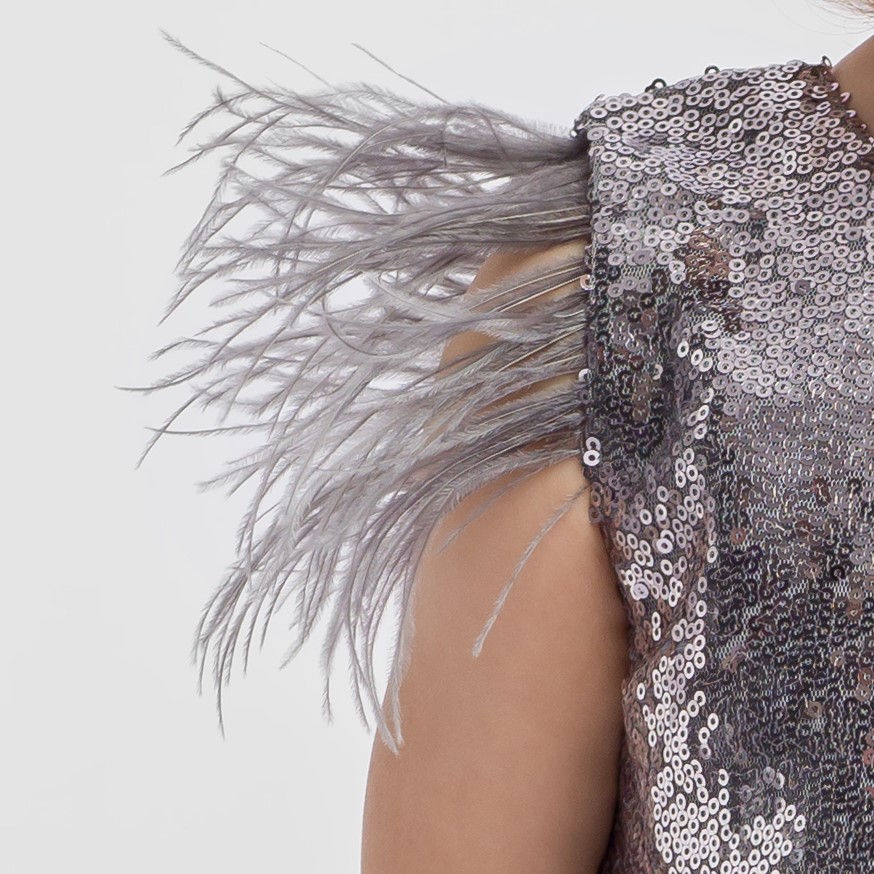 Gornji dio haljine ukrašen je šljokicama, a donji dio je od tila s podstavom. Nježno perje koje izlazi iz ramena haljine daje neobičan šarm. Haljina je izrađena od visokokvalitetnog materijala koji osigurava zadovoljavajuću lakoću tijekom plesa i igara.