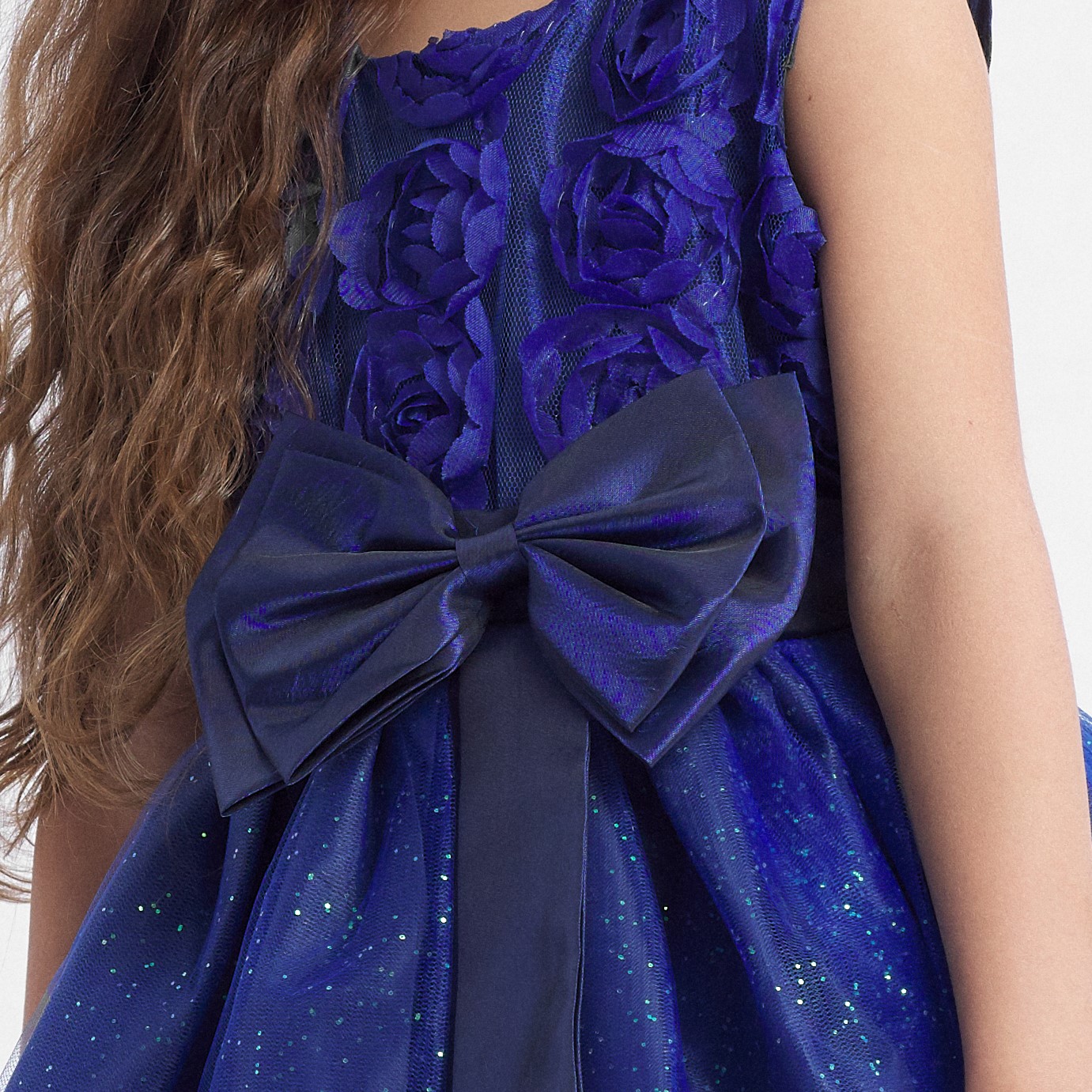 Mornarsko plava poput tamnog mladog mjeseca. Svjetluca kao zvjezdano ponoćno nebo. Lagana kao nalet proljetnog vjetra. Plava Floria haljina za djevojčicu prijedlog je za one koji traže tajanstvenu, nježnu i jedinstvenu haljinu za posebne prilike. Kombinacija raznih tekstura, duboke nijanse haljine i svjetlucavog sjaja učinit će od vaše kćeri pravu zvijezdu – i u doslovnom i u prenesenom smislu.
