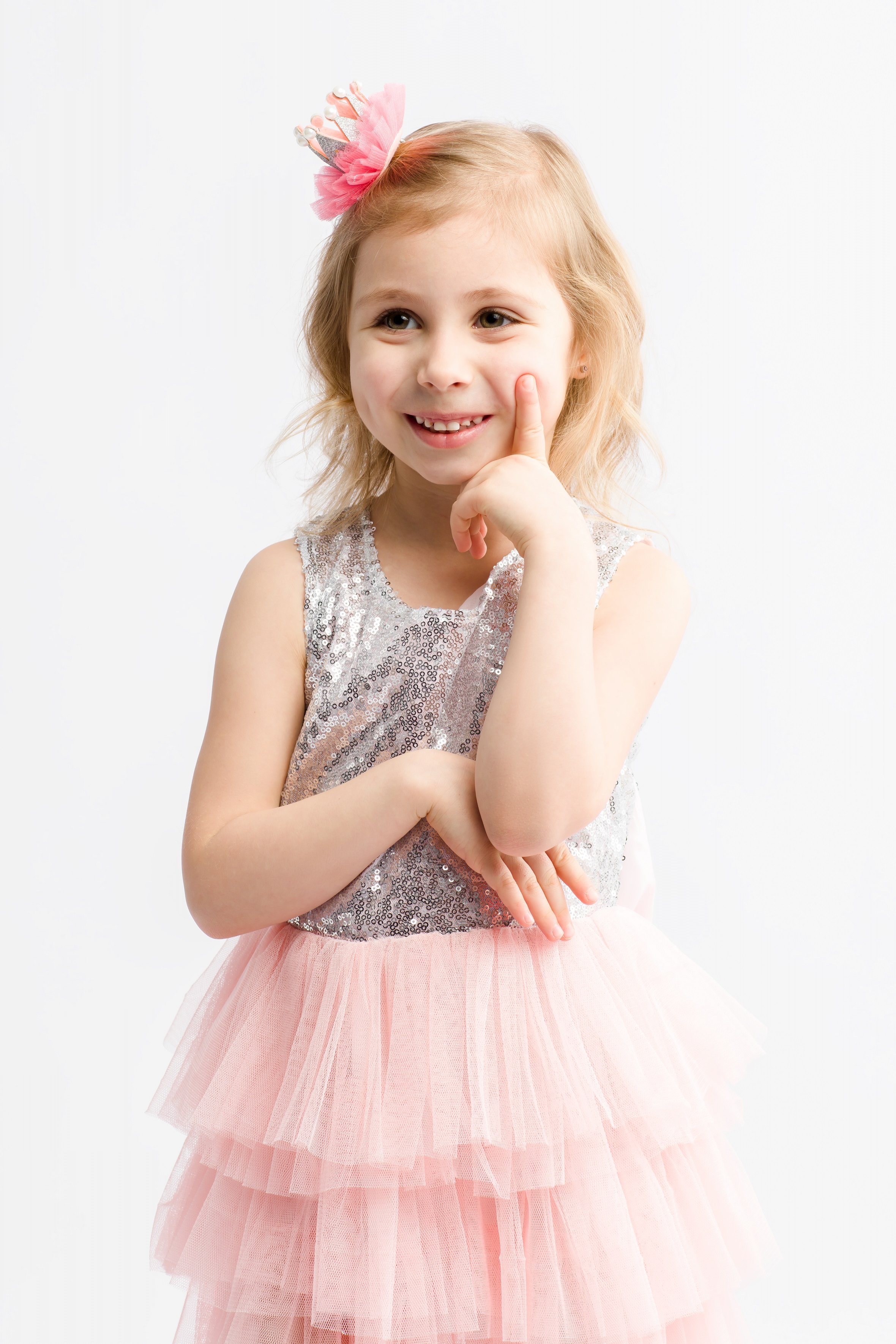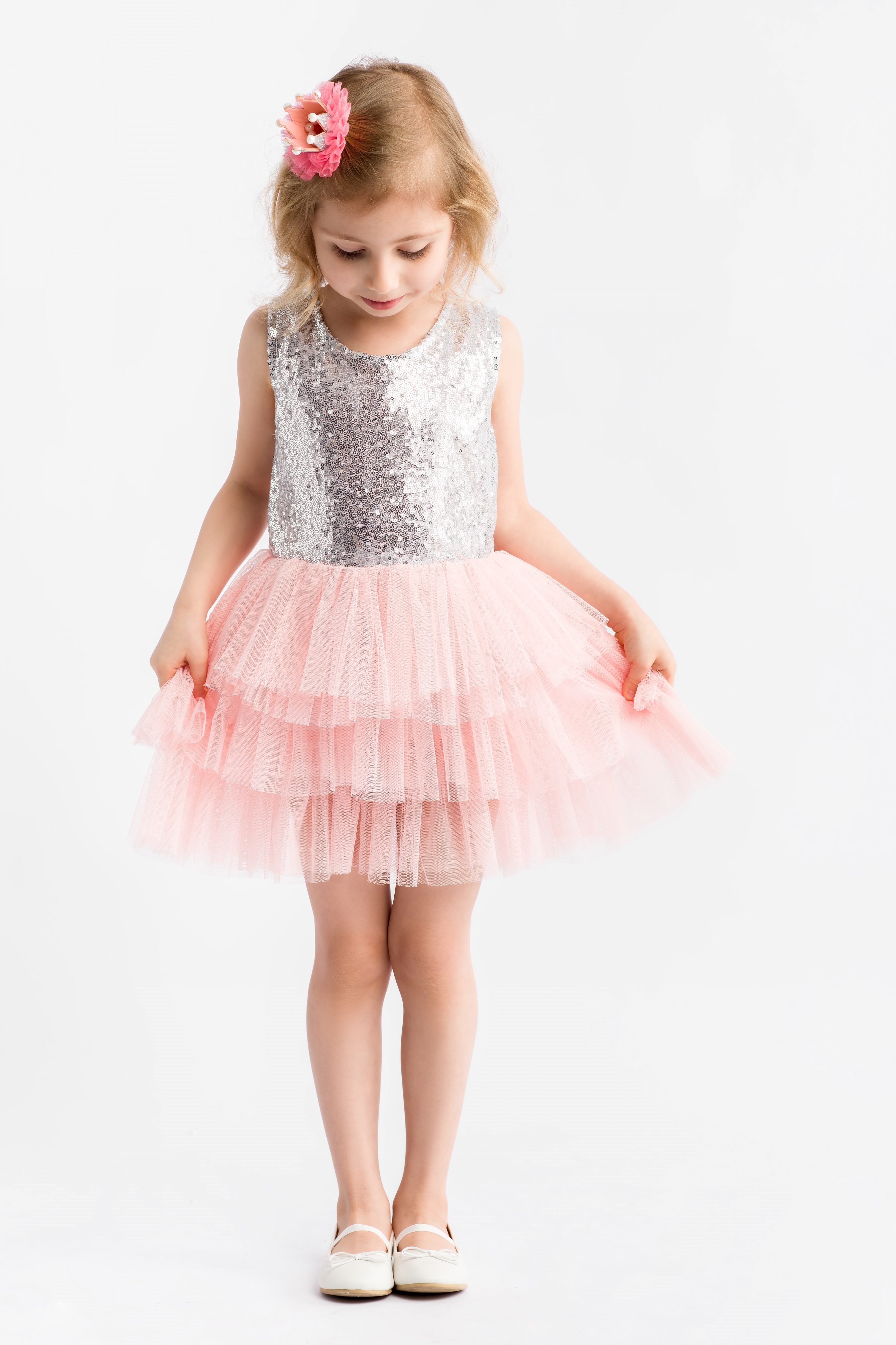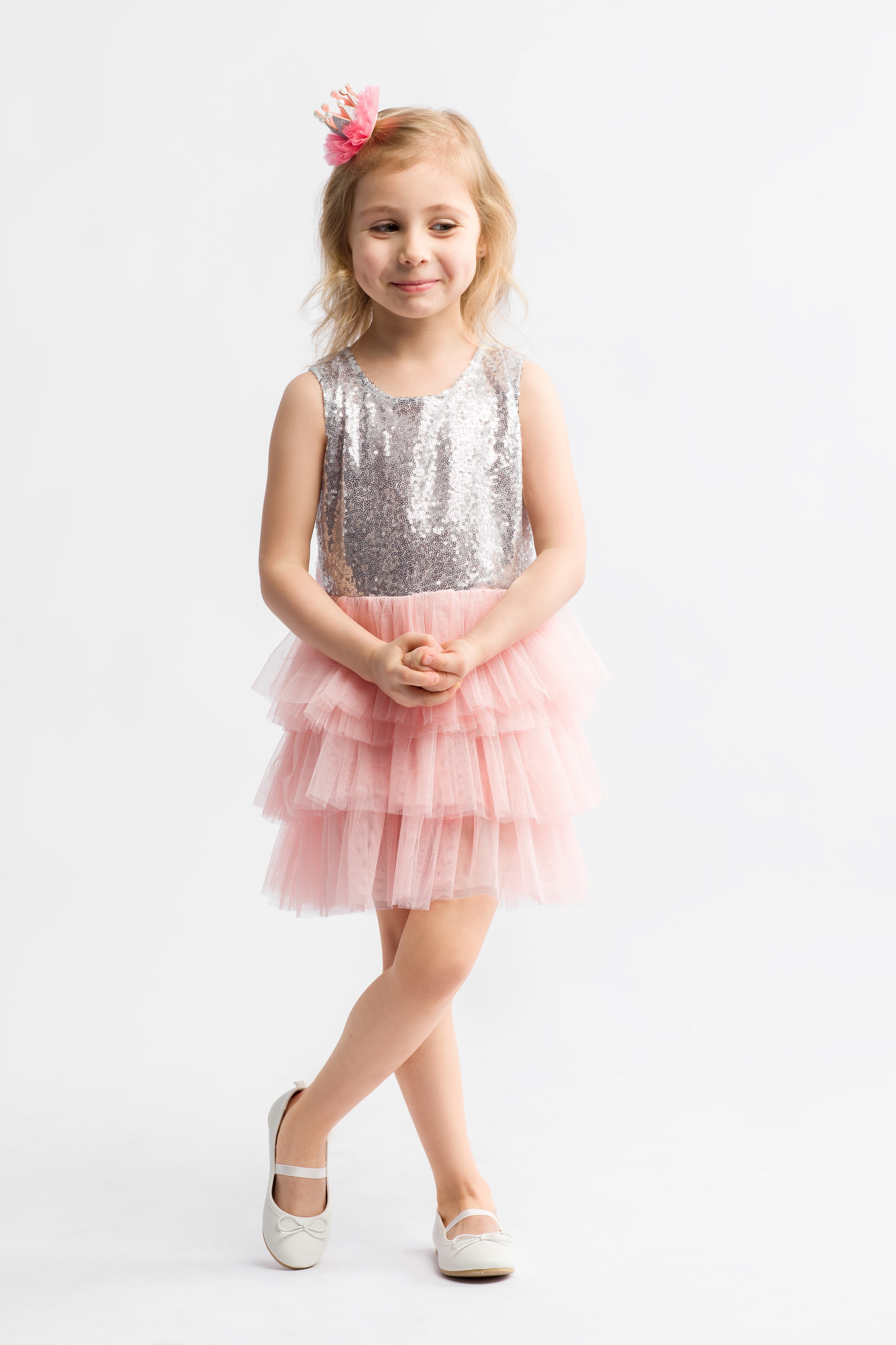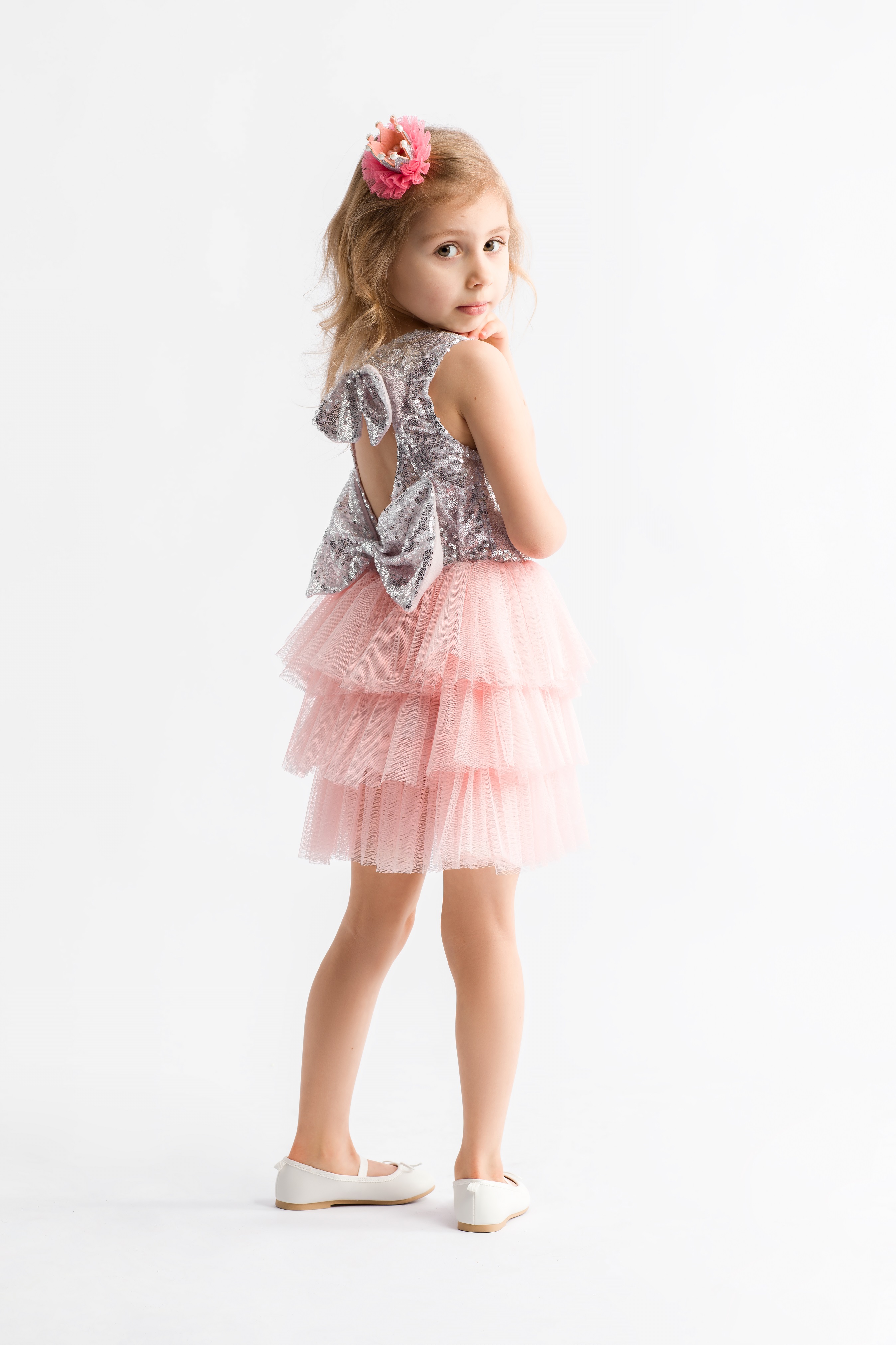 Niepowtarzalna, elegancka sukienka wizytowa dla dziewczynki Frezi w kolorze różowym z cekinami.