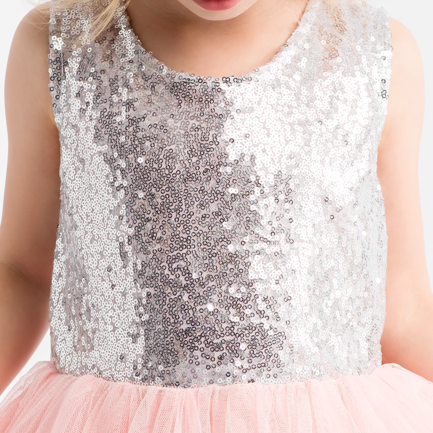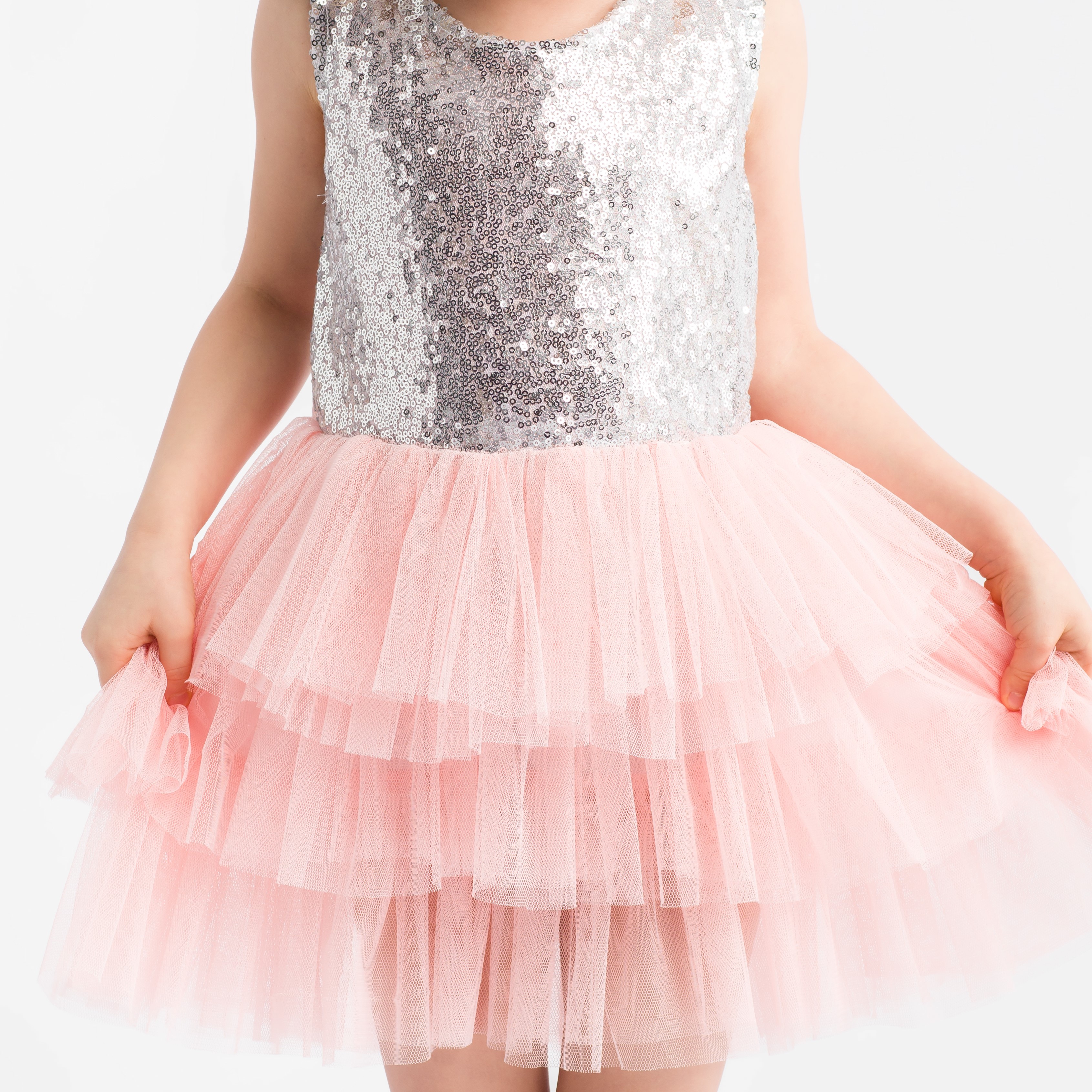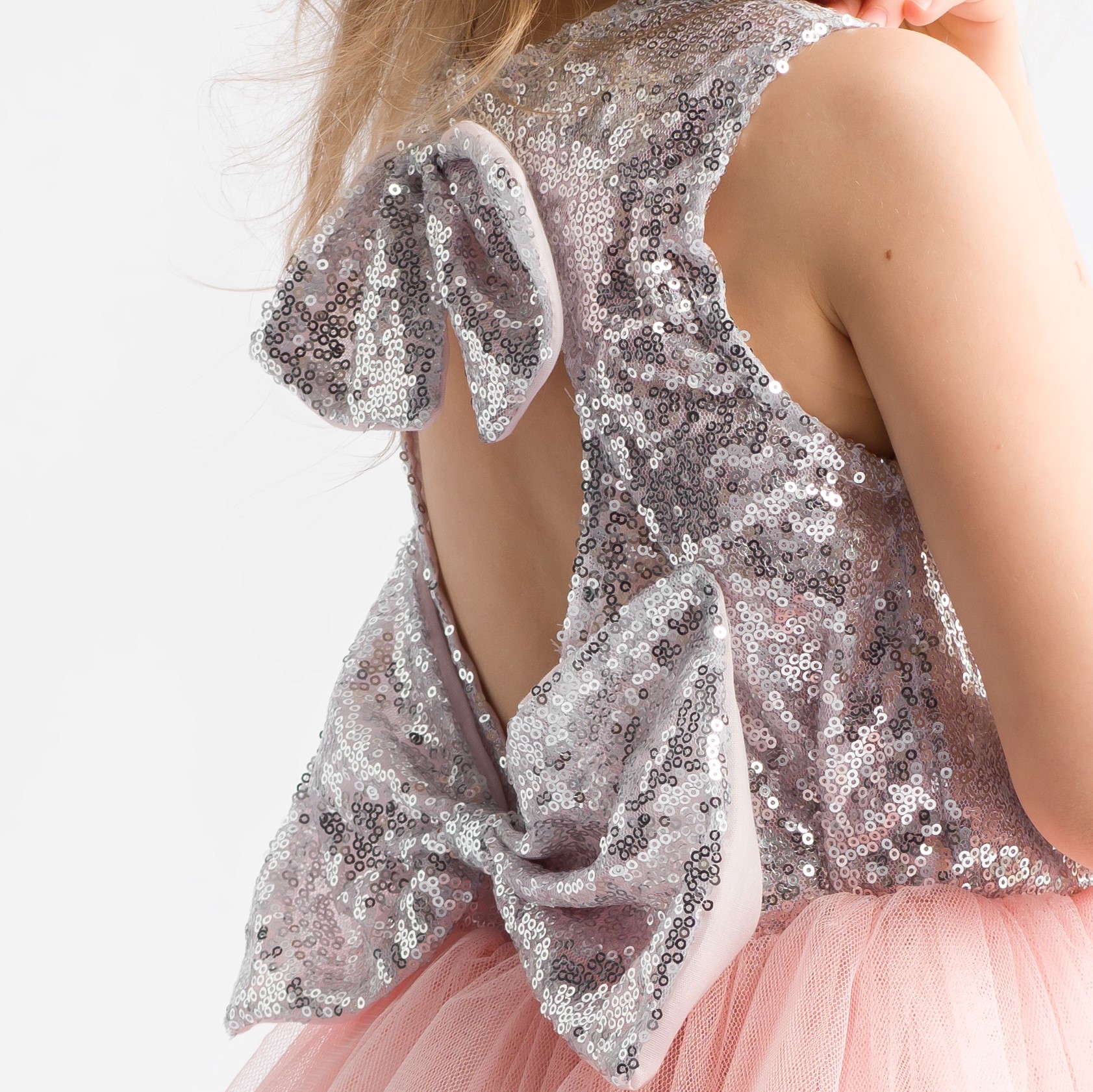Góra ozdobiona cekinami, natomiast dół tiulowy. Niezwykłości sukience nadaje finezyjne wycięcie z tyłu, a kokardy dodatkowo wzbogaca urok kreacji. Wszystko to wykonana z wysokiej jakości materiału zapewniającego komfort podczas tańców i zabaw.